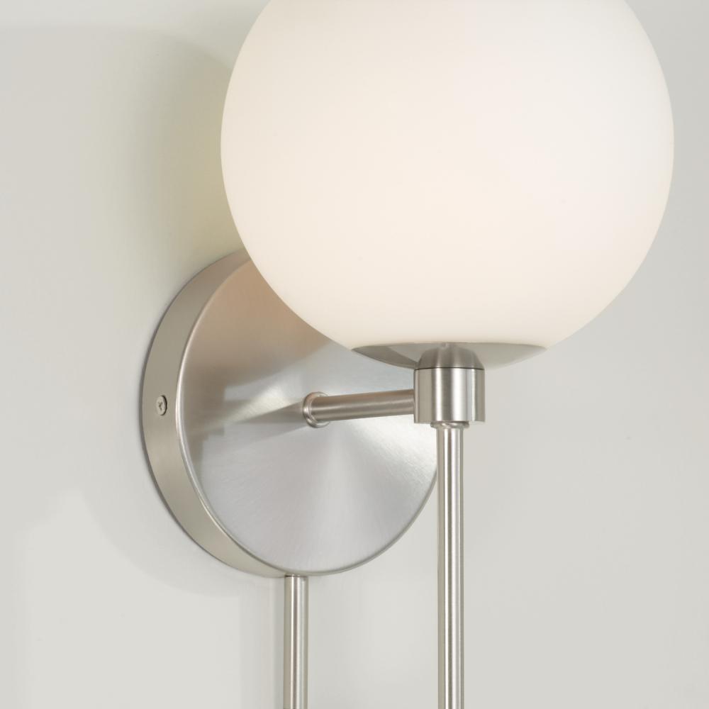 Playful forms meet sophisticated style in the Ansley 1-Light Sconce for HomePlace. The curved stem draws the eye toward the Soft White glass globe shade, while the Brushed Nickel finish creates a classic aesthetic.
