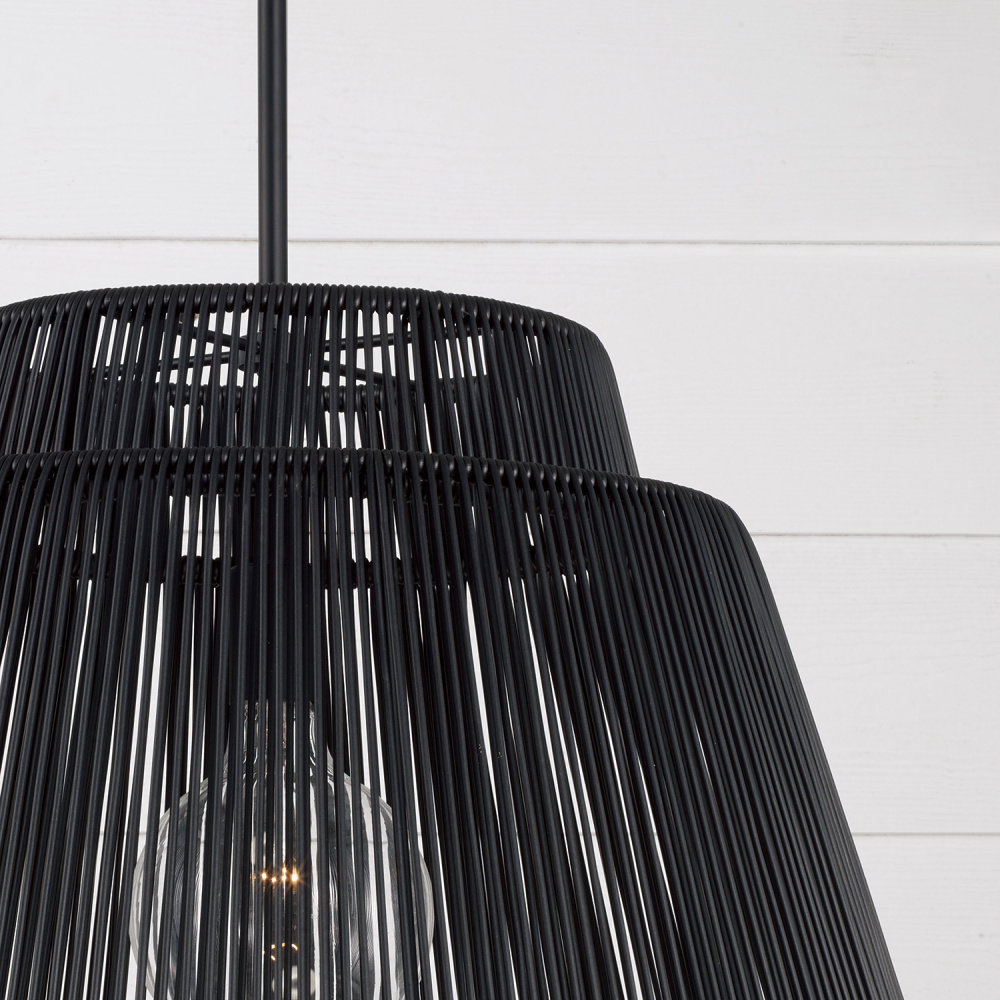 Purposefully crafted for interior and exterior spaces, the Jasper Indoor/Outdoor Pendant seamlessly blends durable design with high style. Paired with the Matte Black finish, the weather-resistant hand-wrapped resin delivers a modern aesthetic. Rated for Damp Locations and backed by our one-year warranty.