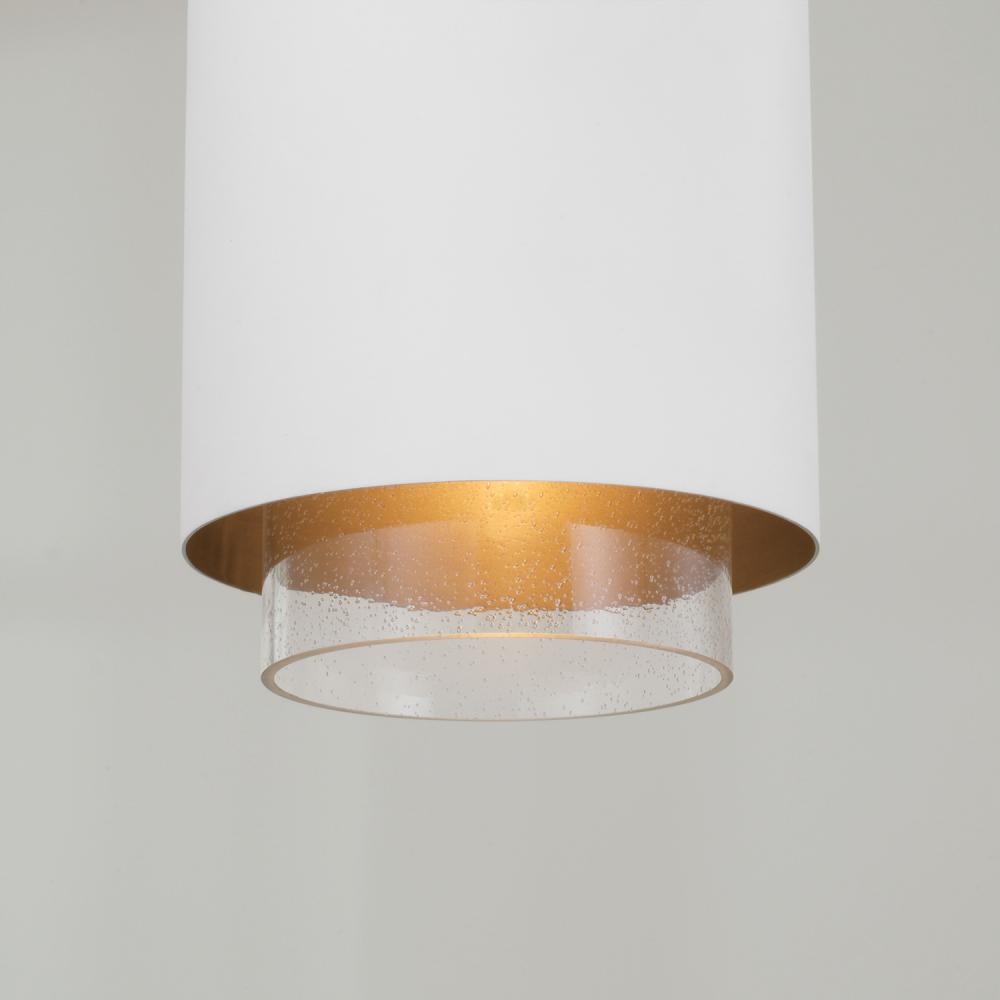 The Matte Brass accents and cylindrical Matte White metal shade compliments the seeded glass detail for a sophisticated mix.