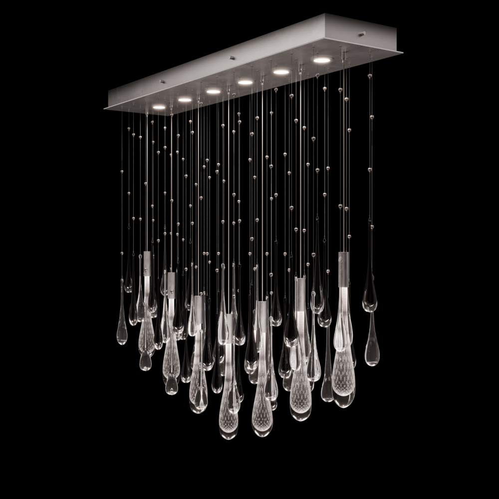 This LED pendant captures the beauty of motion suspended in time-artisan-blown glass “rain” drops infused with swirling mist and illuminated from within. Offered in Silver, Gold, or Copper drops, each paired with clear and black droplets and complemented by a hand-applied ombré finish that enhances its luminous depth.