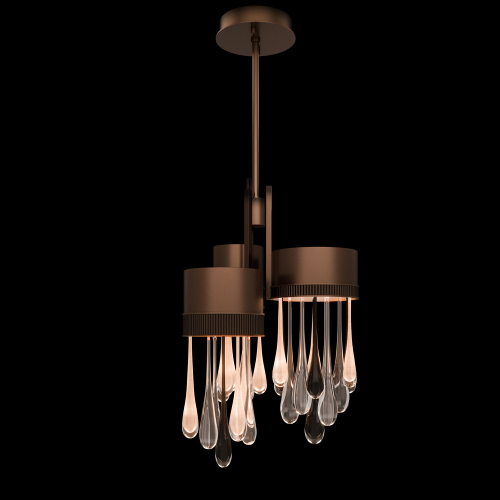 This LED pendant captures the beauty of motion suspended in time-artisan-blown glass “rain” drops infused with swirling mist and illuminated from within. Offered in Silver, Gold, or Copper drops, each paired with clear and black droplets and complemented by a hand-applied ombré finish that enhances its luminous depth.