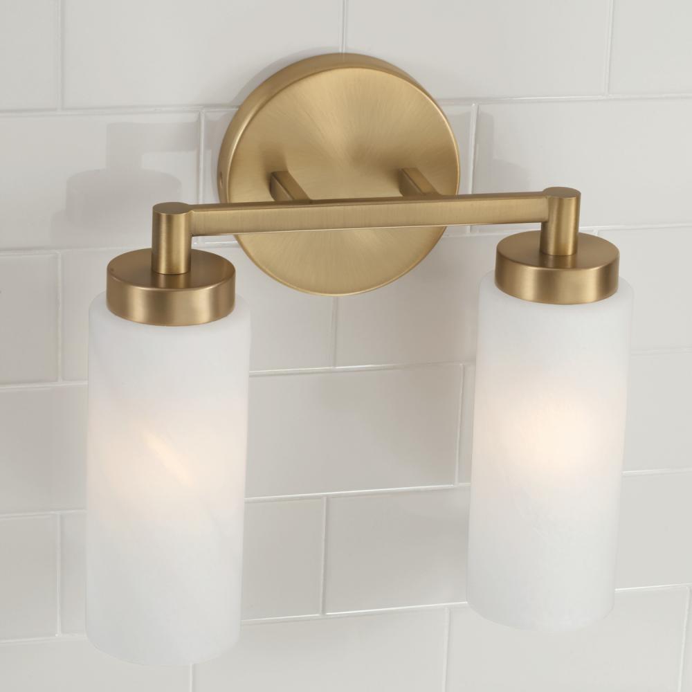 Sleek forms and modern contours create the Alyssa 2-Light Vanity. The Aged Brass finish adds warmth to the earthy, elegant Faux Alabaster glass shades, while the elongated lines deliver sophisticated style. Hang socket facing up or down to seamlessly suit any space.