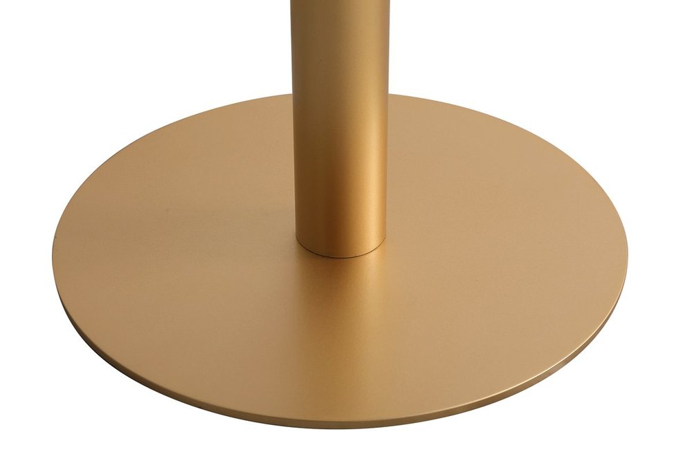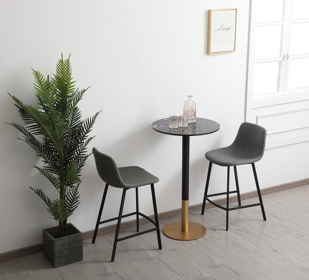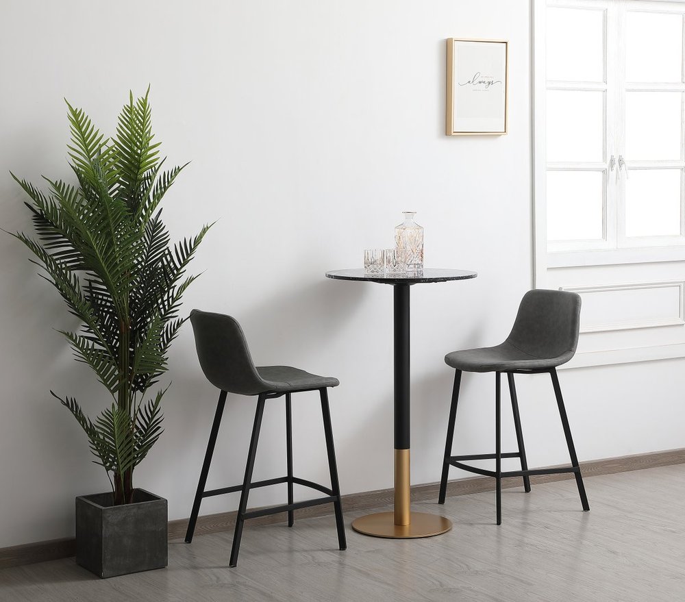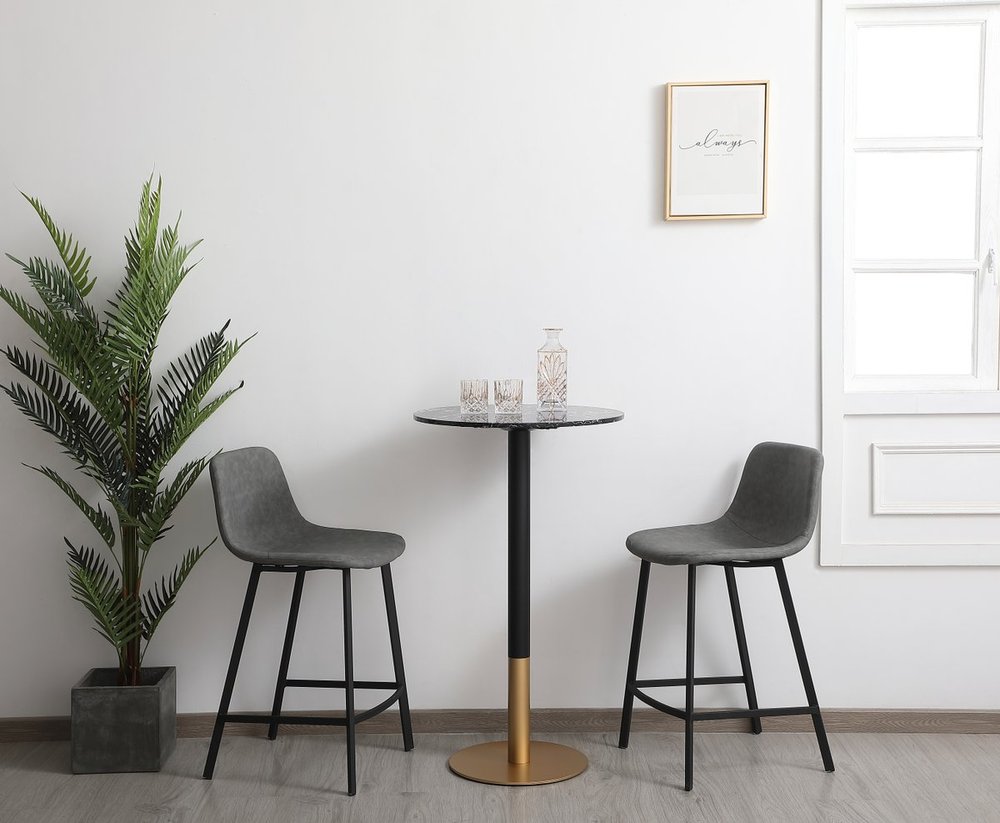 The Ronan pub table makes a nice addition to your home. This pub table provides additional dining space in your kitchen. Features a matte brass base that is accented with black metal stand and a faux marble top. The table top is 23.5 inch wide making it big enough for two but still small enough to use the space economically.