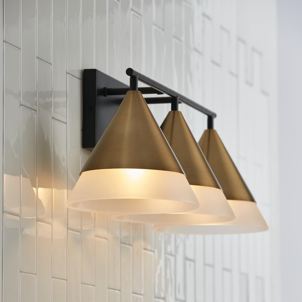 Create striking elegance in any powder room with the Avant 3-Light Vanity. The pointed Aged Brass metal shades widen to slightly translucent Frosted Glass to create an all-around stunning glow. Finished with Matte Black details, this luminaire evokes a distinct style.