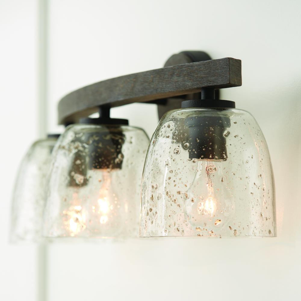 24.5"W x 9.5"H 3-Light Vanity in Carbon Grey and Black Iron with Stone Seeded Glass Handcrafted of Wire-Brushed Mango Wood