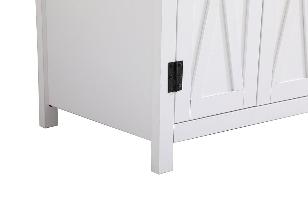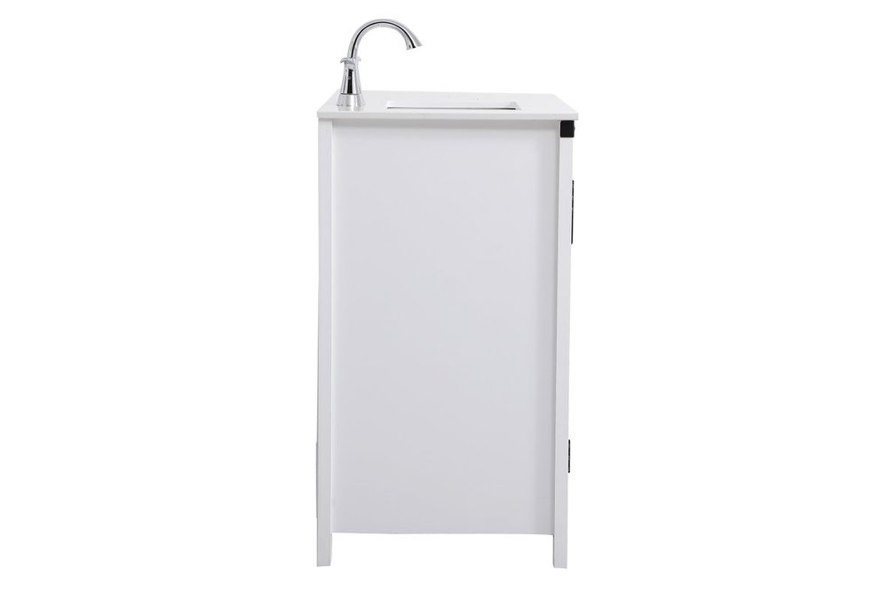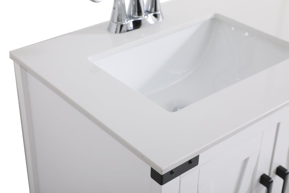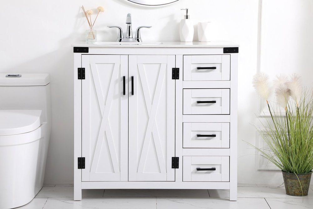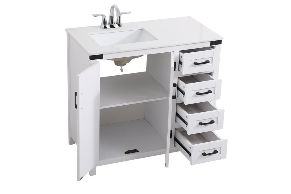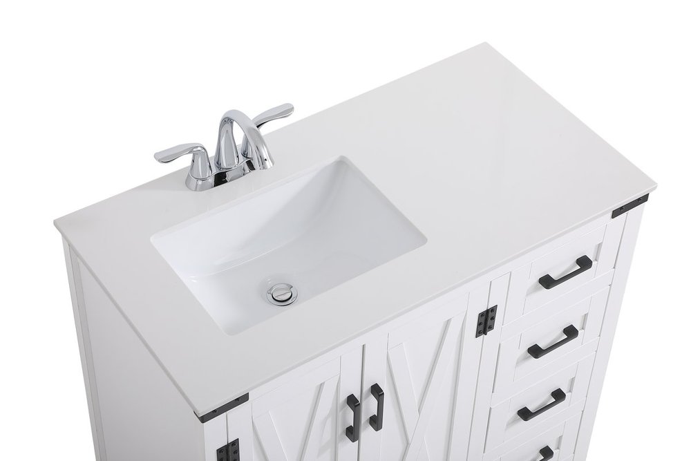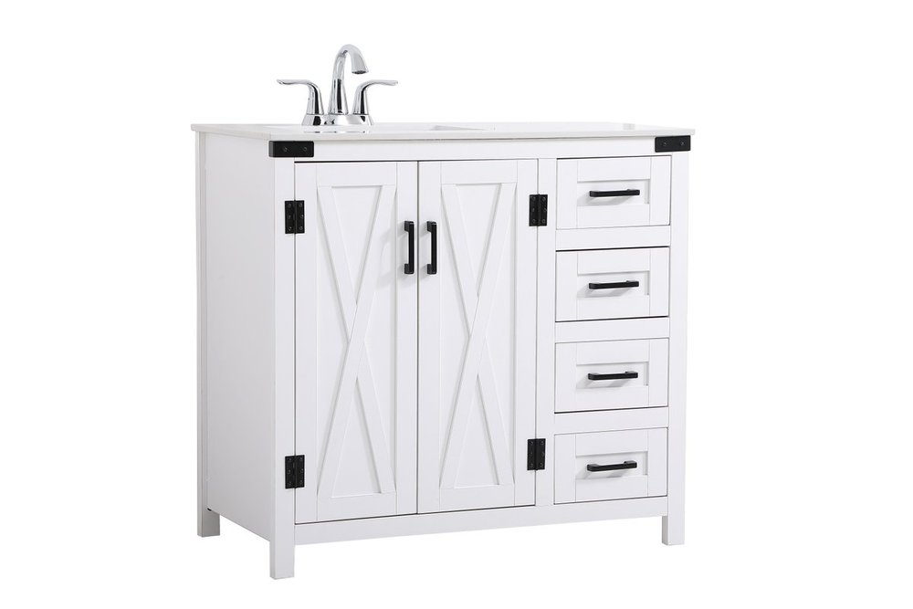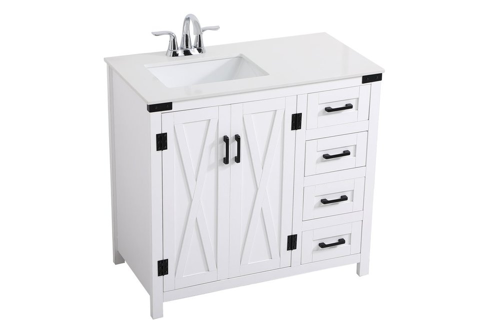The Grant Collection 36 in. vanity is a practical and stylish upgrade for your bathroom. Its white finish is highlighted by the engineered white stone top featuring an under-counter rectangular sink. The cross patterned cabinet doors are decorated with bold black hinges and bar pulls. The cabinet has four pullout drawers, ideal for towels, washcloths and bath accessories
