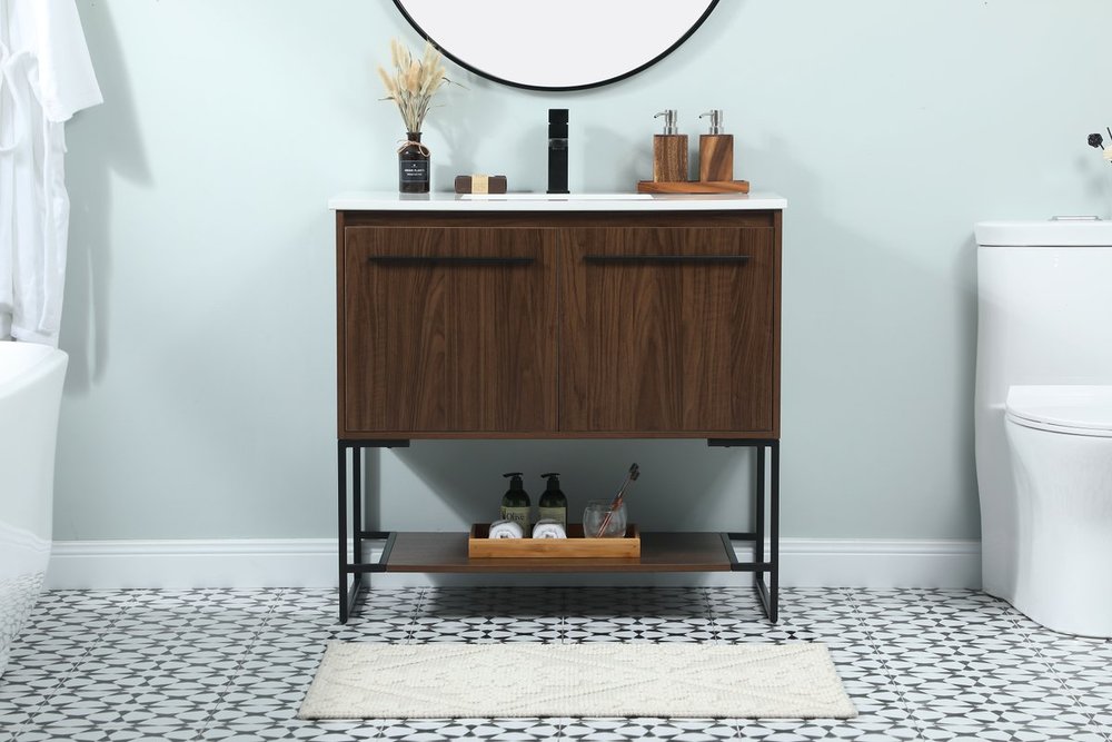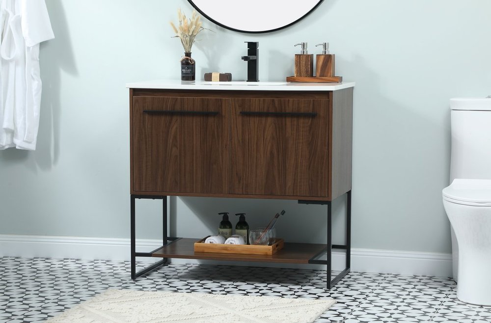 Comes with an undermount porcelain sink and durable ivory white engineered marble stone top