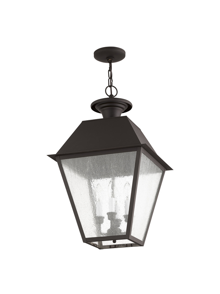With stunning seeded glass and a bronze finish, this outdoor hanging lantern will make an elegant addition to any outdoor space. Formed from solid brass & traditionally-inspired, this downward hanging outdoor hanging lantern is perfect for a driveway, back porch or entry way.
