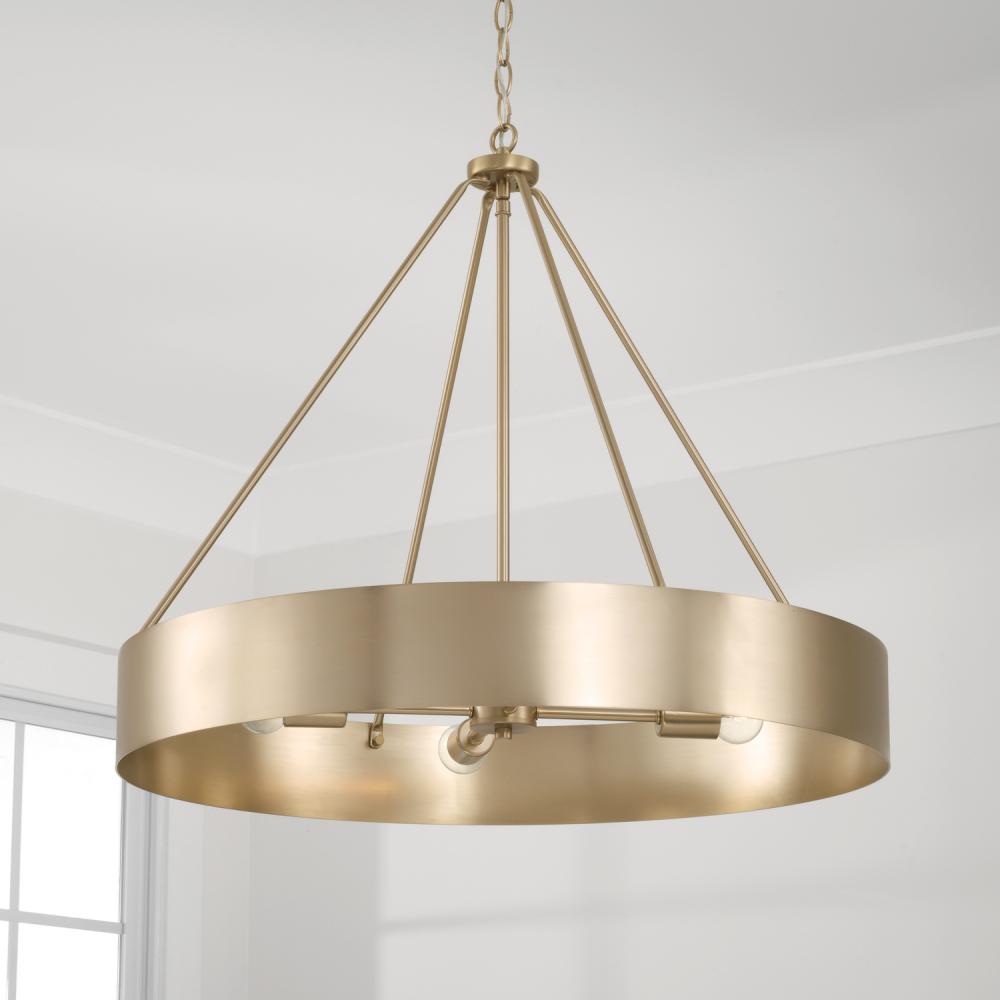 Contemporary style with classic appeal. The Weller 4-Light Chandelier combines an elegant, circular silhouette with angled lines for a sleek aesthetic. The Matte Brass finish brings a hint of warmth and subtle shine.