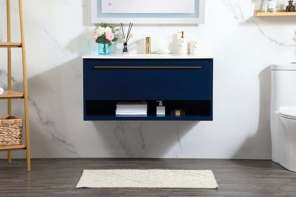 Save space and make your bathroom appear bigger with this floating vanity. Its minimal design will have you in awe, while its clean lines will leave your room feeling fresh and uncluttered. The Single u-drawer pulls out for storage while the open space below allows you to place extra towels or various other essentials. The ivory white engineered marble counter top with porcelain sink adds refined luxe while the aluminum barpull style handle adorn the vanity face.