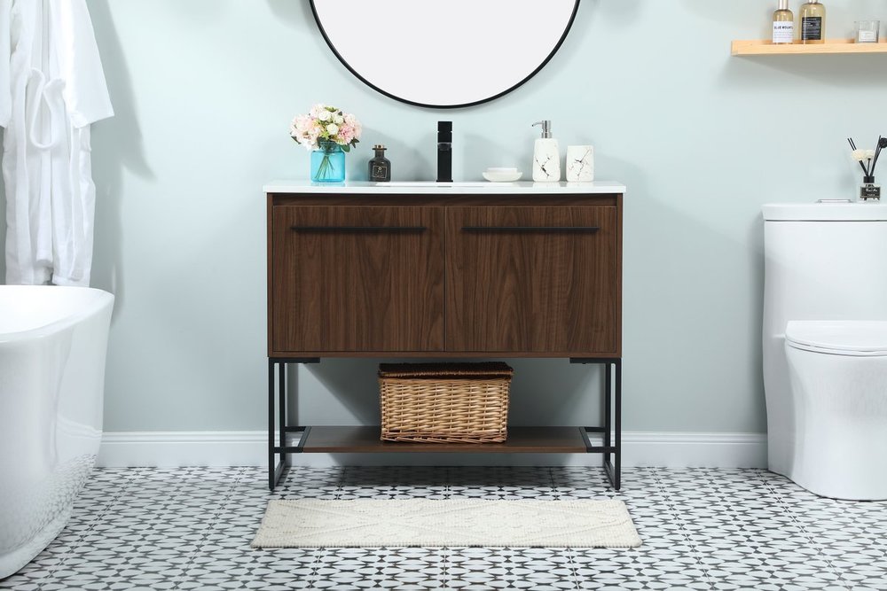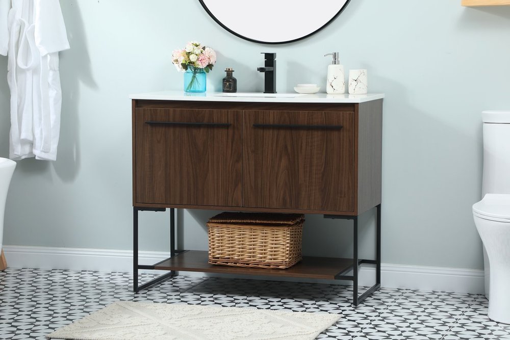 Comes with an undermount porcelain sink and durable ivory white engineered marble stone top
