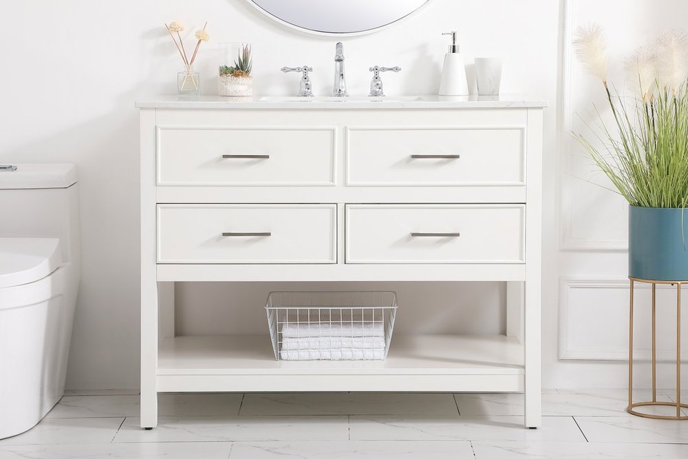 Make the most of your space with this traditional style bathroom vanity. Complements well with many aesthetics with its beautiful finish, calacatta engineered marble countertop, and the contemporary slender handle bar that sits on two upper false drawer and two lower u-shaped drawer, allowing you to store an assortment of bathroom essentials. The lower shelf makes it the perfect space to hold new towels for your guests. This compact vanity ensures both form and function in your bathroom or powder room for you and your guests.