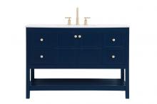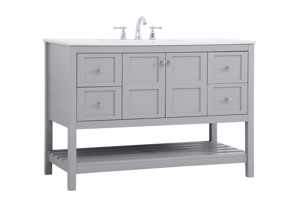 The subtle beauty of the Theo collection 48" vanity in a gray finish exudes comfortable luxury. Its modern, yet traditional beauty will surely dress up your bathroom or powder room without any fuss. The white stone countertop and porcelain undermount sink shows quiet opulence, and the legs support upright without fail. Brushed Nickel hardware complements the trendy gray finish, with pulls adorning the two cabinet doors and four drawers, showcasing ample storage space within. Slated shelf allows for additional space to organize your towels. Whether this vanity is in your bathroom or for guests, its presence will surely elevate the aesthetics of your room.