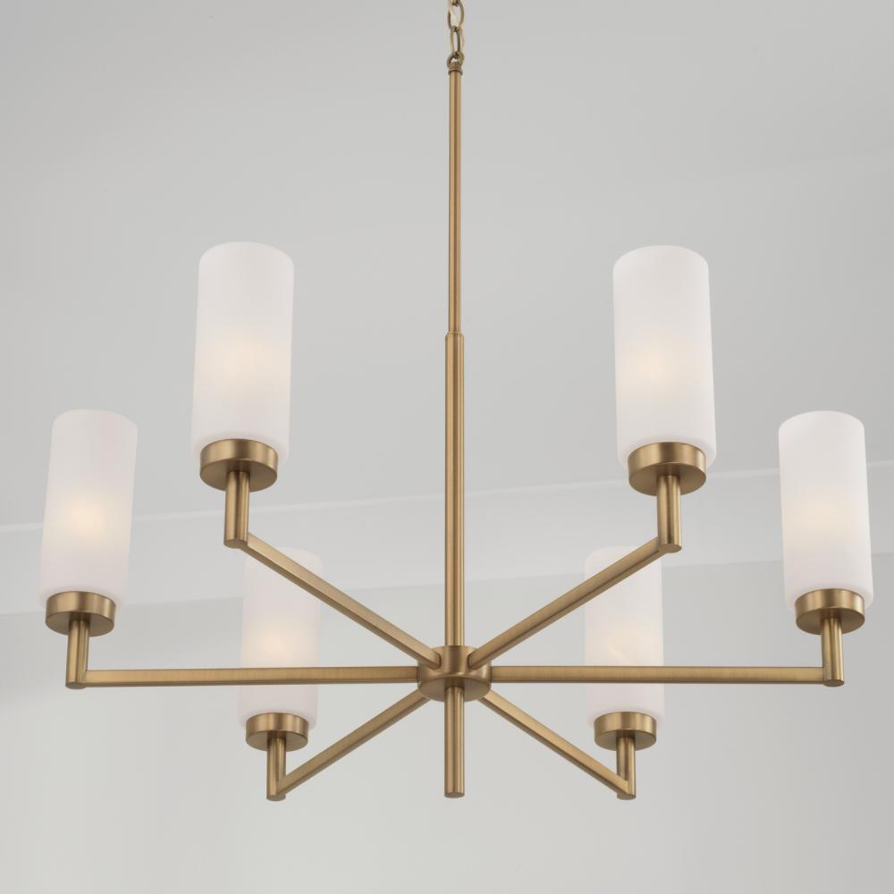 Sleek forms and modern contours create the Alyssa 6-Light Pendant. The elongated Faux Alabaster glass shades deliver earthy, elegant style, while the Aged Brass finish gives a nod to mid-century style.