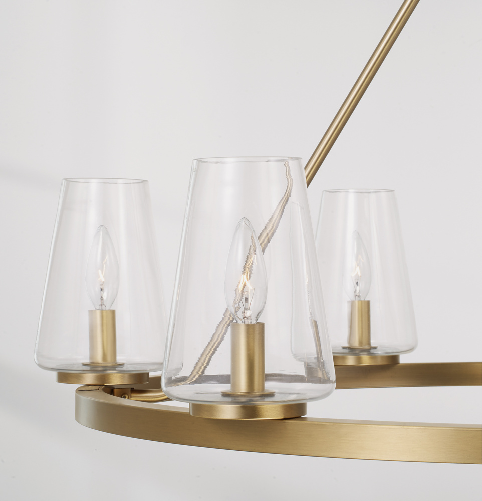 Classic curves and clear glass create the Aaron 6-Light Medium Chandelier for HomePlace. The tapered cylindrical shades bring refined style with optimal light output, while the Aged Brass finish adds elegance to the ring silhouette. Also available in a 4-Light.