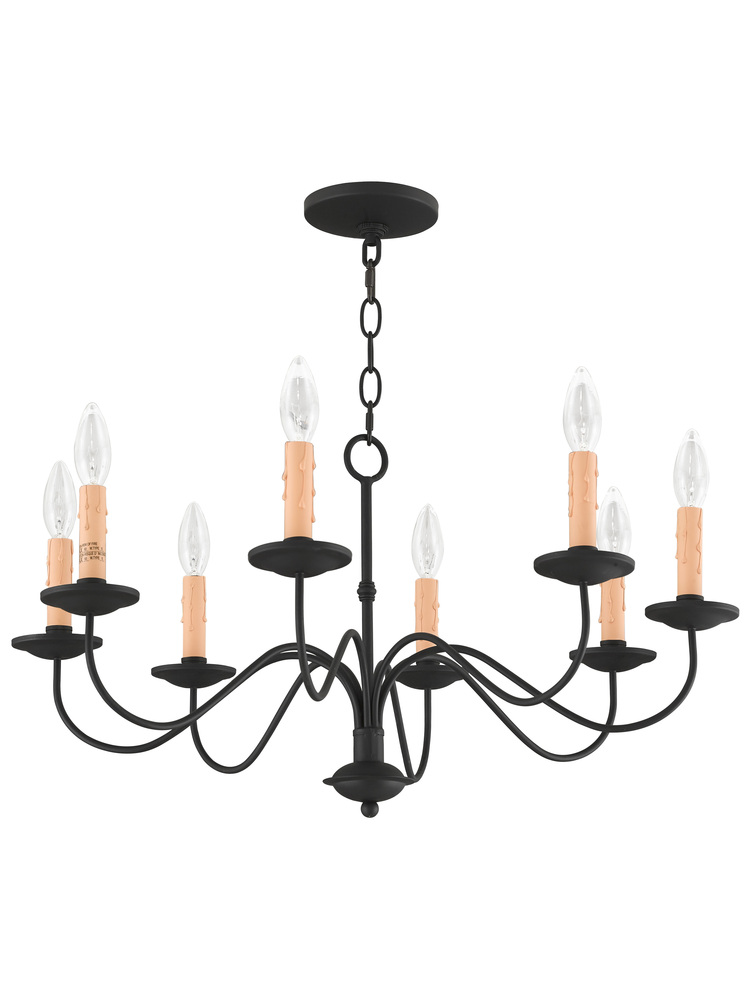 The Clean Design Of This Steel Construction Eight Light Chandelier Is Enhanced With A Black Finish. The Sweeping Arms Create A Slim Silhouette From Which The Candelabra Bulbs Emit Their Soft, Romantic Glow. Its Informal, Transitional Beauty Works Well With Many Room Decor Schemes.