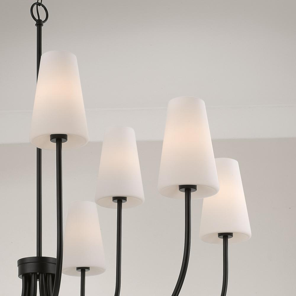 DETAILS: Elongated Soft White glass shades and sleek Matte Black details bring an elegant aesthetic to the large-scale silhouette.