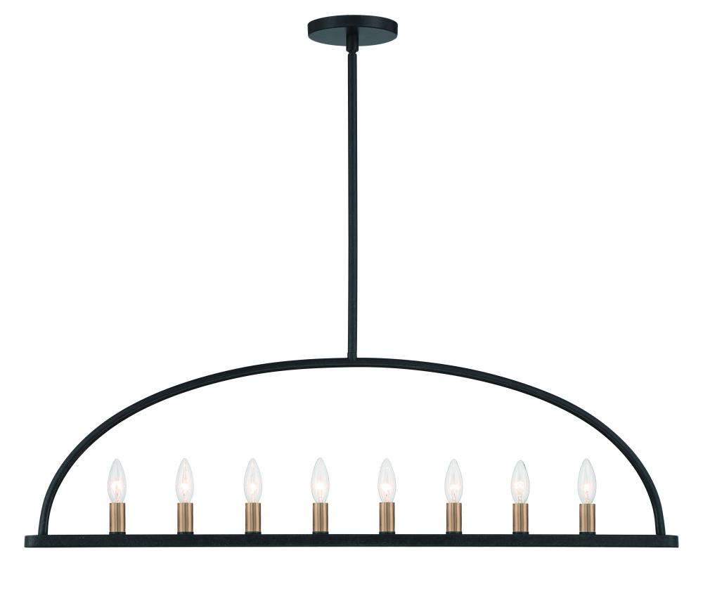 The Abbott linear chandelier presents a simple, streamlined shape and clean lines. The open-concept frame features a metal arch and a sleek, narrow rod with a series of thin bulbs. Mounted above an island or over a dining room table, this fixture appeals to a minimalist sense of style and comes with both white and gold candle sleeves. The Abbott comes in vibrant gold and black finish.