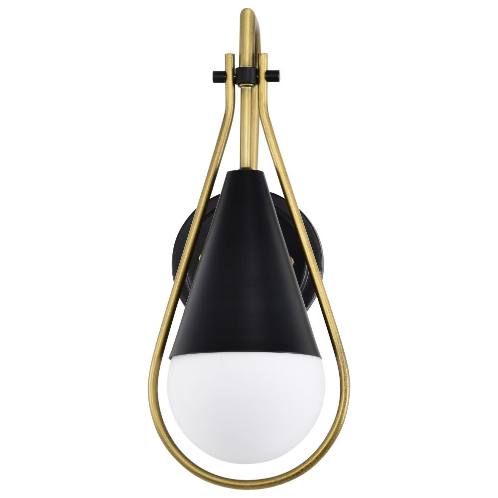 A modern collection with a twist, the Admiral 60-7901 one light wall sconce features a dual finish, unique design, and a fashionable statement for home luminaires. A suspended tear-dropped shape is comprised of matte black with natural brass elements encom