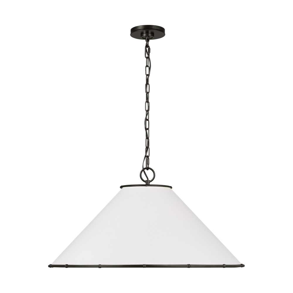Crafted with Steel in a Aged Iron finish with silk screen white inside clear outside glass diffuser and white linen fabric shade