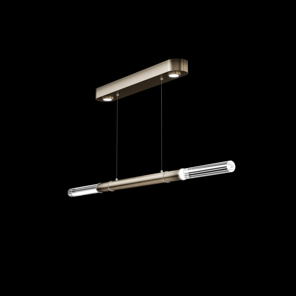 Suspended by adjustable cords, this LED fixture features straight tubular lines and the inclusion of metals carefully handcrafted to transition from parchment to magnificent glass, culminating in a stunning beam of light. Available in a wide range of exquisite finishes, including our five standard finishes and our newest Soft Ombre Bronze & Soft Ombre Silver, with choice parchment colors. Also available with no parchment. Upper & lower lights can be wired independently for single or dual light control.