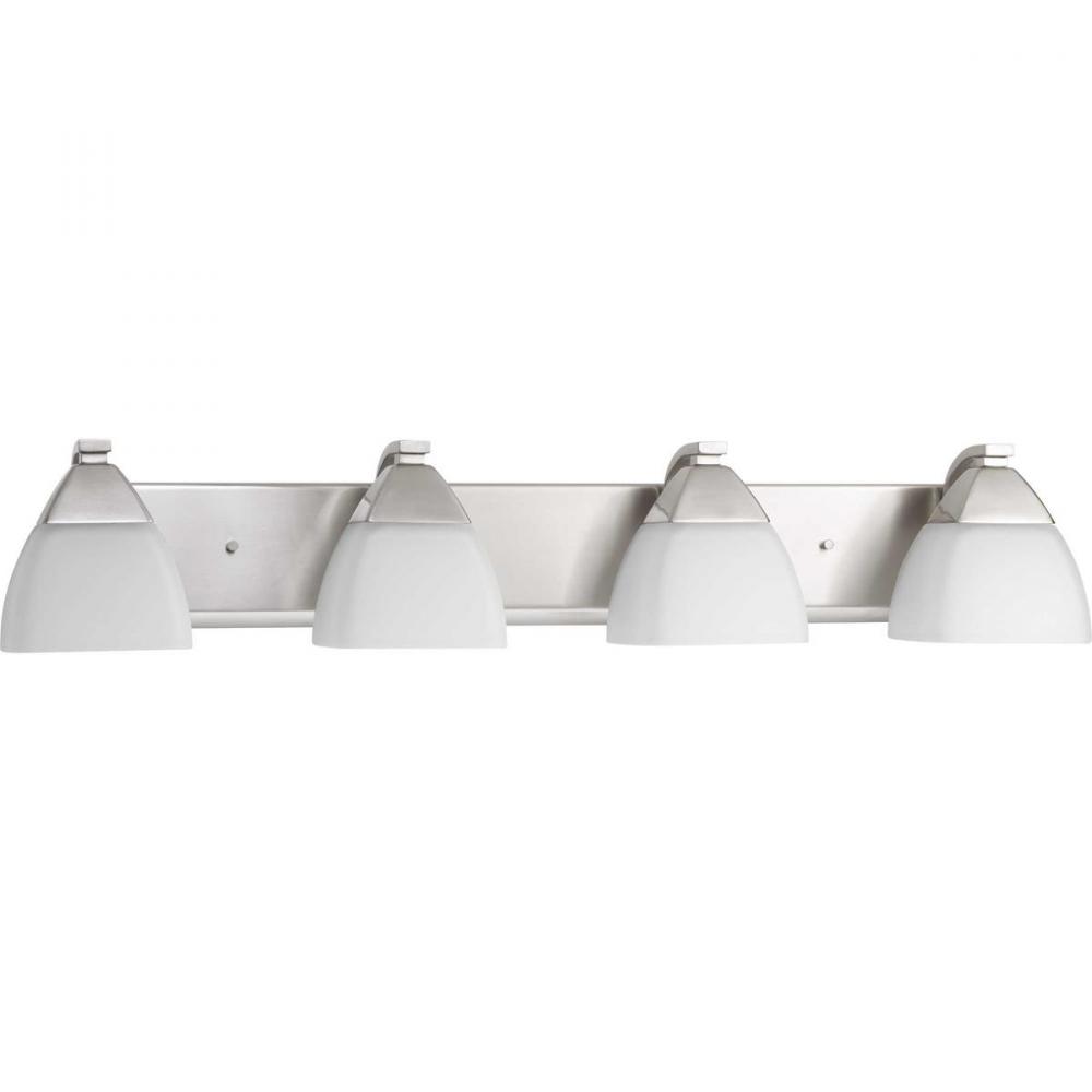 Ideal for a bathroom;Perfect for modern and transitional style settings;Beautiful brushed nickel finish;Square etched white glass shade;Mount the light fixture facing up or down;Use 4 medium base bulbs that are sold separately (100 W max - LED/CFL/incandes