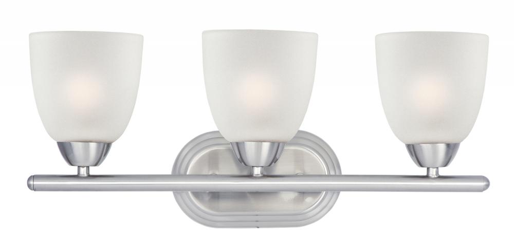 This transitional design works in any style home. Full length oval backplates support simple bell-shaped, Frosted glass shades. Available in Satin Nickel, Matte Black, and Polished Chrome.