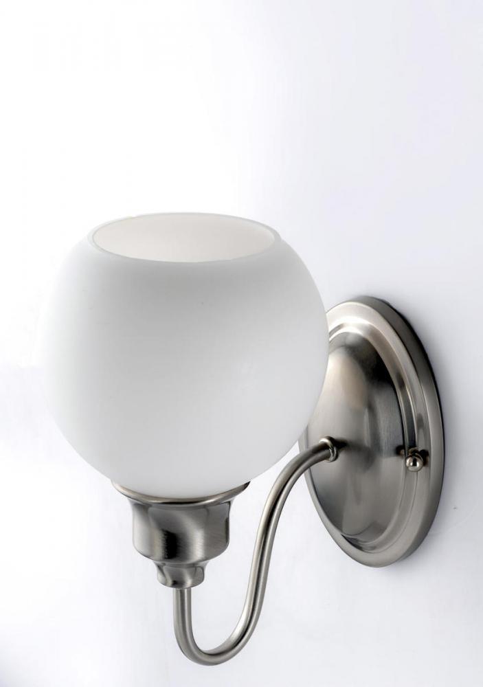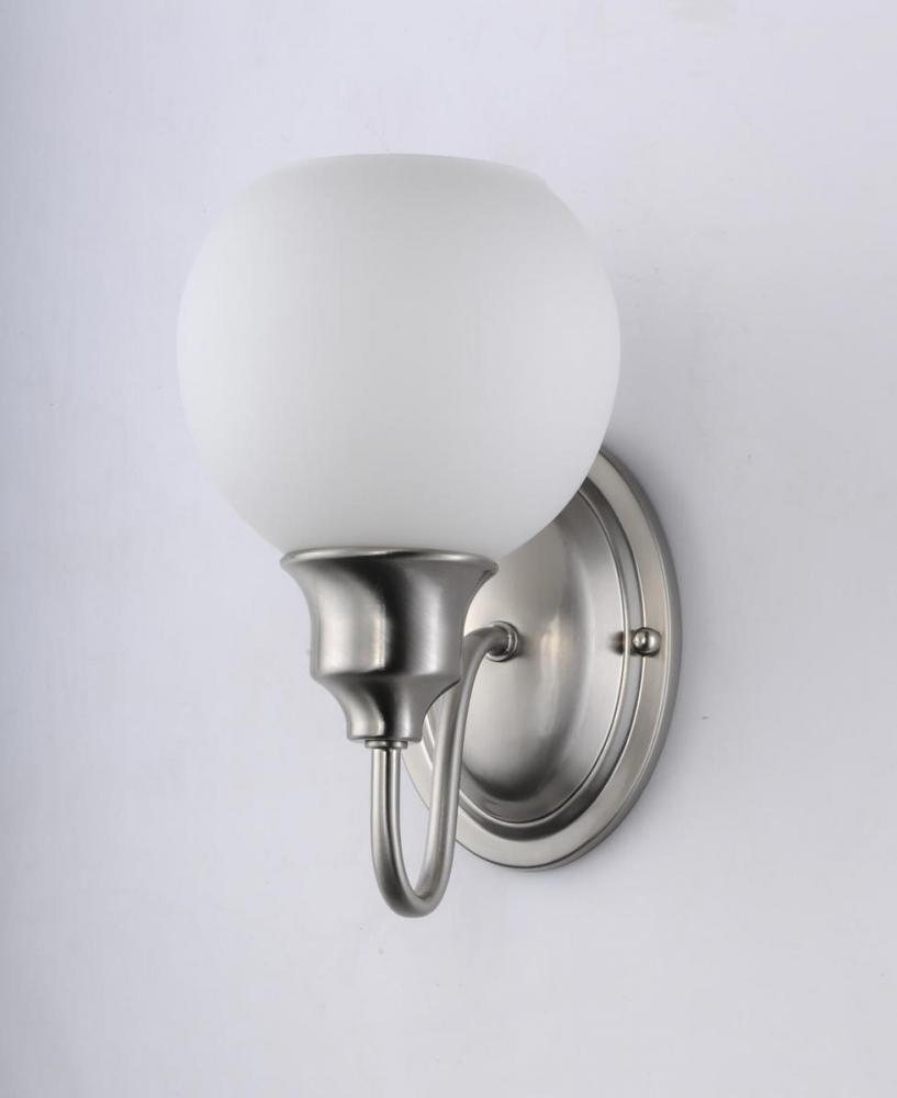 Curved arms support circular glass with an open bottom which can be installed facing up or down. Available in your choice of Polished Chrome with Clear glass or Satin Nickel with Satin White glass.