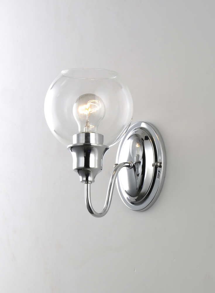Curved arms support circular glass with an open bottom which can be installed facing up or down. Available in your choice of Polished Chrome with Clear glass or Satin Nickel with Satin White glass.