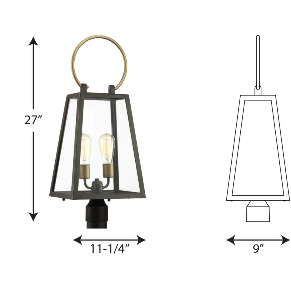 Barnett lanterns deliver timeless appeal with a decidedly modern flair;Features dramatic overscaled loop in a contrasting brass-tone finish;Antique Bronze finish;Large clear panes of glass frame your choice of traditional or vintage style bulbs;Uses two 60