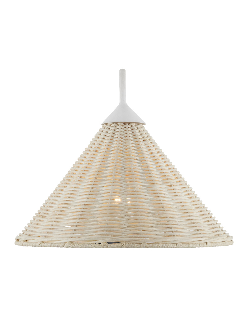 Woven natural arurog reeds create the elemental shade of the Basket White Swing-Arm Wall Sconce. The wrought iron frame and wall plate in a gesso white finish are simple in their design to make this rattan wall sconce perfect for casually chic interiors. Though the bleached white shade reads as seamless to the design, affixed as it is to a smaller flare perfectly in sync with its shape, there is a warmth to it due to the barely discernable natural material from which it is made. This forms a subtle contrast to the crisp metal.