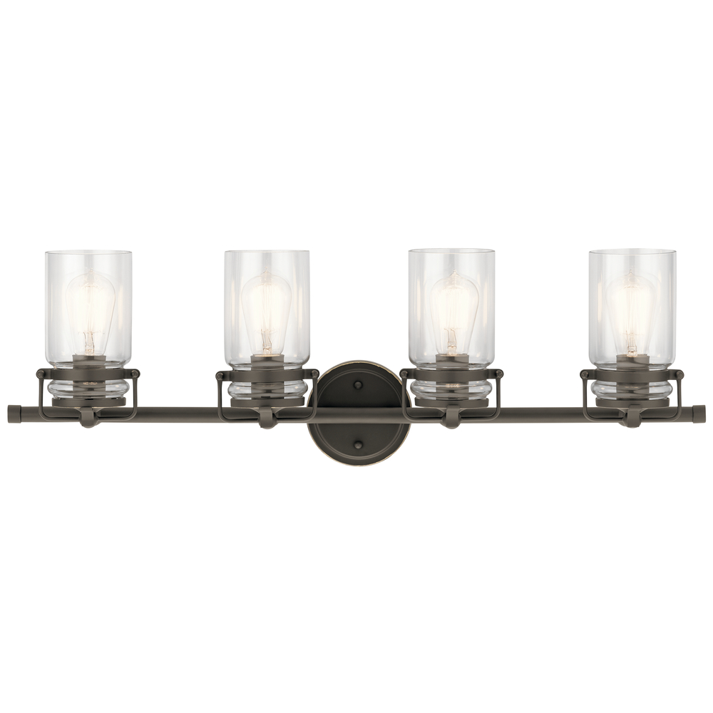 Brinley 32.25" 4 light vanity light features a modern vintage look with its Olde Bronze® finish and clear glass. Inspired by mason jars, the Brinley vanity light is perfect in several aesthetic environments, including modern vintage and transitional.