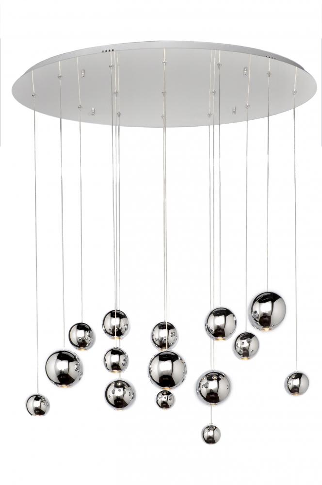 Balls of mirror like Polished Chrome are suspended from adjustable cables, creating a lighting work of art. Each ball contains a high power LED, which through the optical lens, provides ample down lighting and is dimmable.