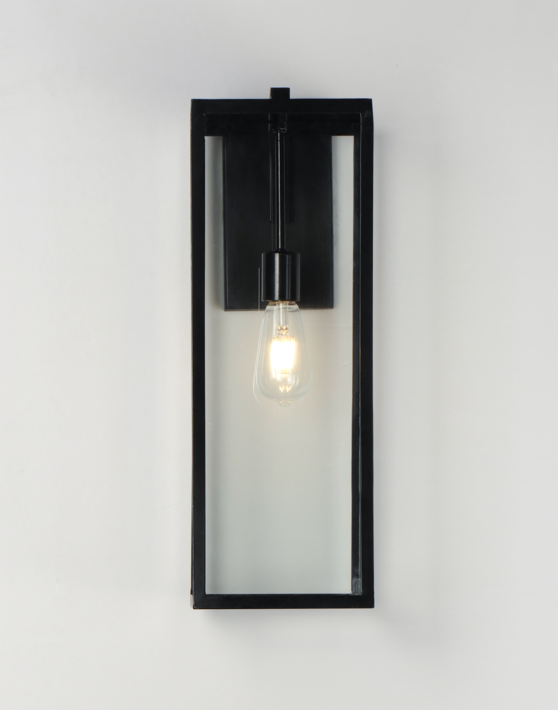 An elongated rectangular shaped design that is both minimalist and industrial. Die cast frames of Dark Bronze support Clear glass panels that provide an unobstructed view of the lantern's interior. Customize with your choice of lamps from vintage to tu
