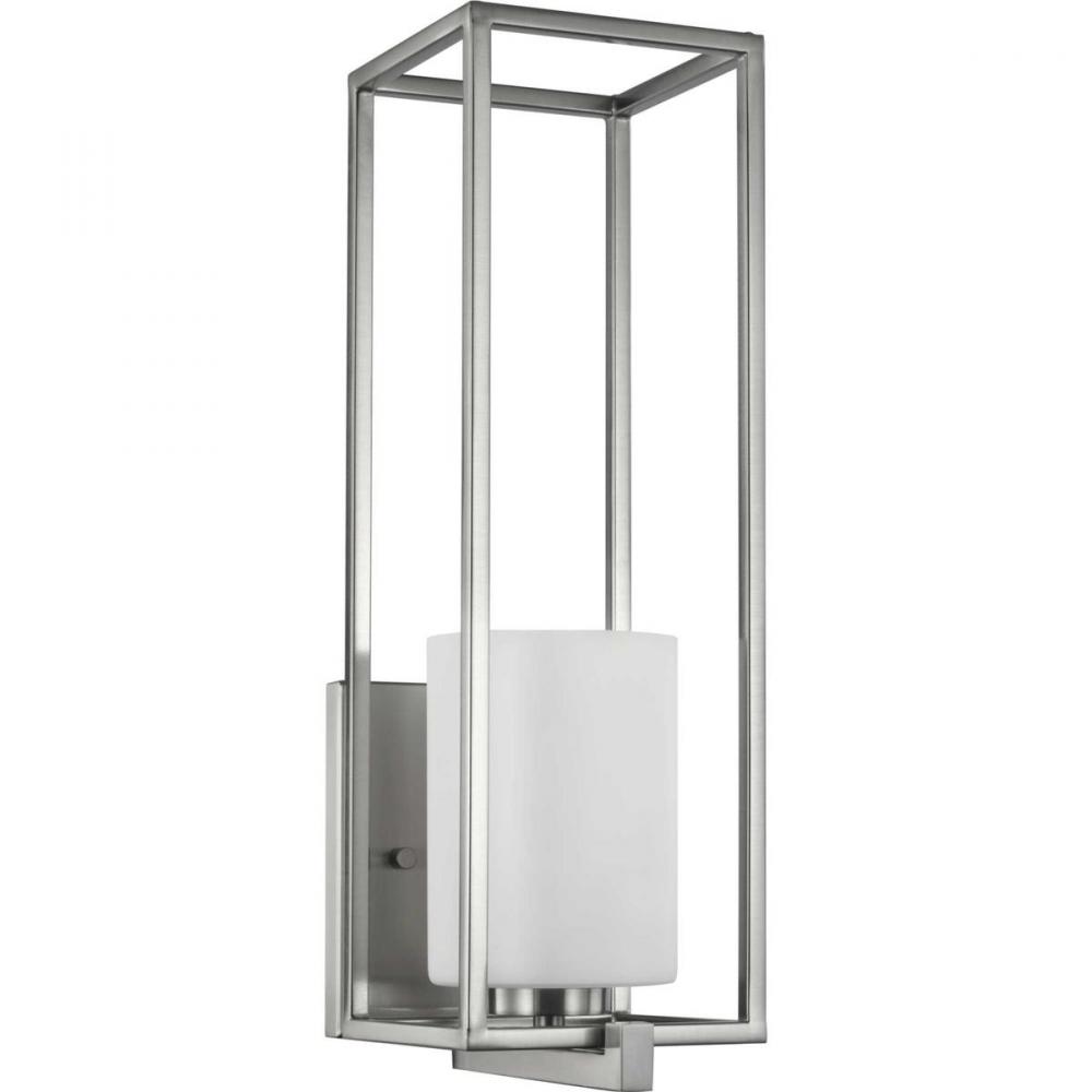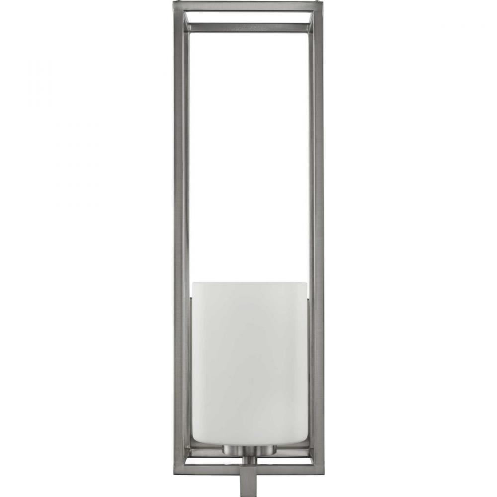 Stick with simple geometric forms and clean crisp lines with this modern wall bracket. A beautiful opal glass shade visually calms the sharp edges of the boxy frame in a masterful stroke of design excellence. The frame is coated in a classic brushed nickel finish that contrasts the light shade. The light fixture is just right for spaces in need of a subtle, feminine touch.