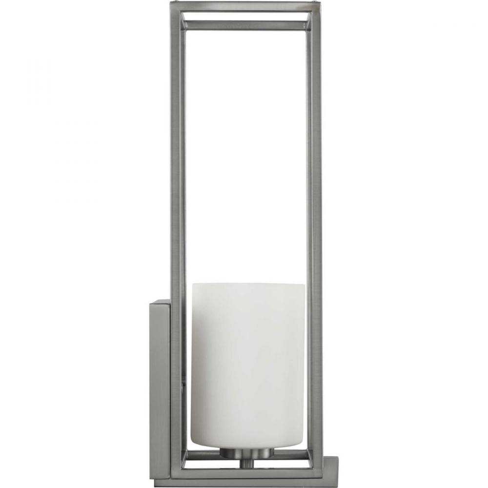 Stick With Simple Geometric Forms And Clean Crisp Lines With This Modern Wall Bracket. A Beautiful Opal Glass Shade Visually Calms The Sharp Edges Of The Boxy Frame In A Masterful Stroke Of Design Excellence. The Frame Is Coated In A Classic Brushed Nickel Finish That Contrasts The Light Shade. The Light Fixture Is Just Right For Spaces In Need Of A Subtle, Feminine Touch.