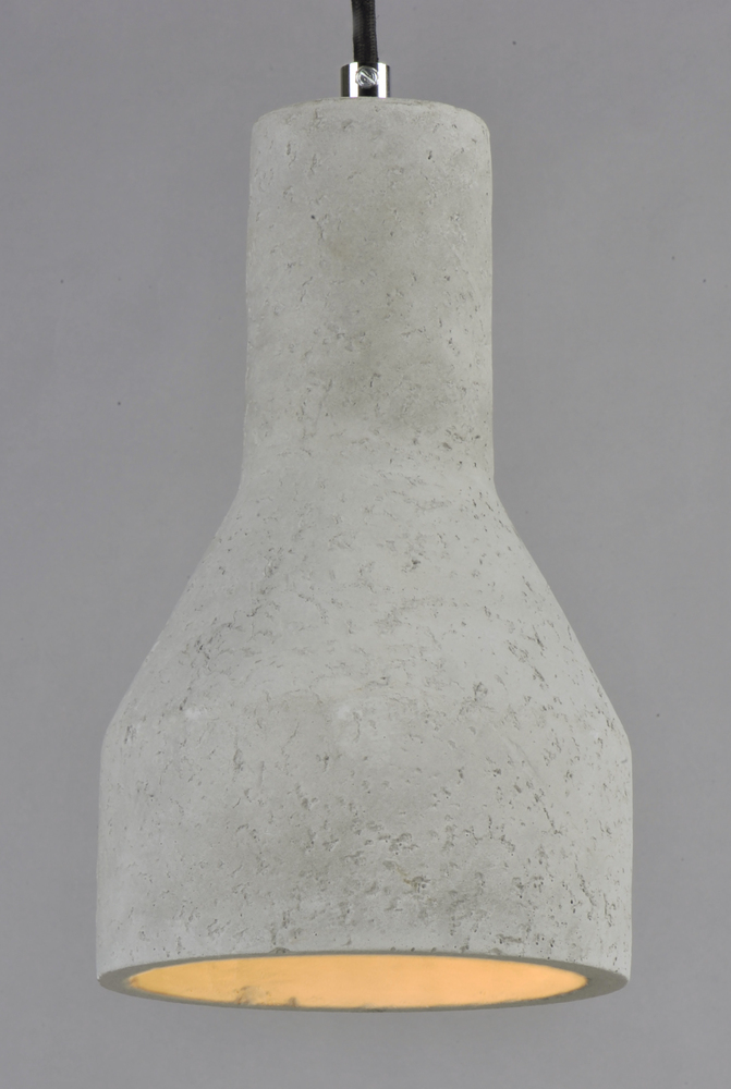 Pendants molded in natural Gray finish concrete cement provide a unique urban contemporary design element Metal Polished Chrome hardware contrasts beautifully with the black fabric covered wire. Powerful and efficient illumination is provided by included G