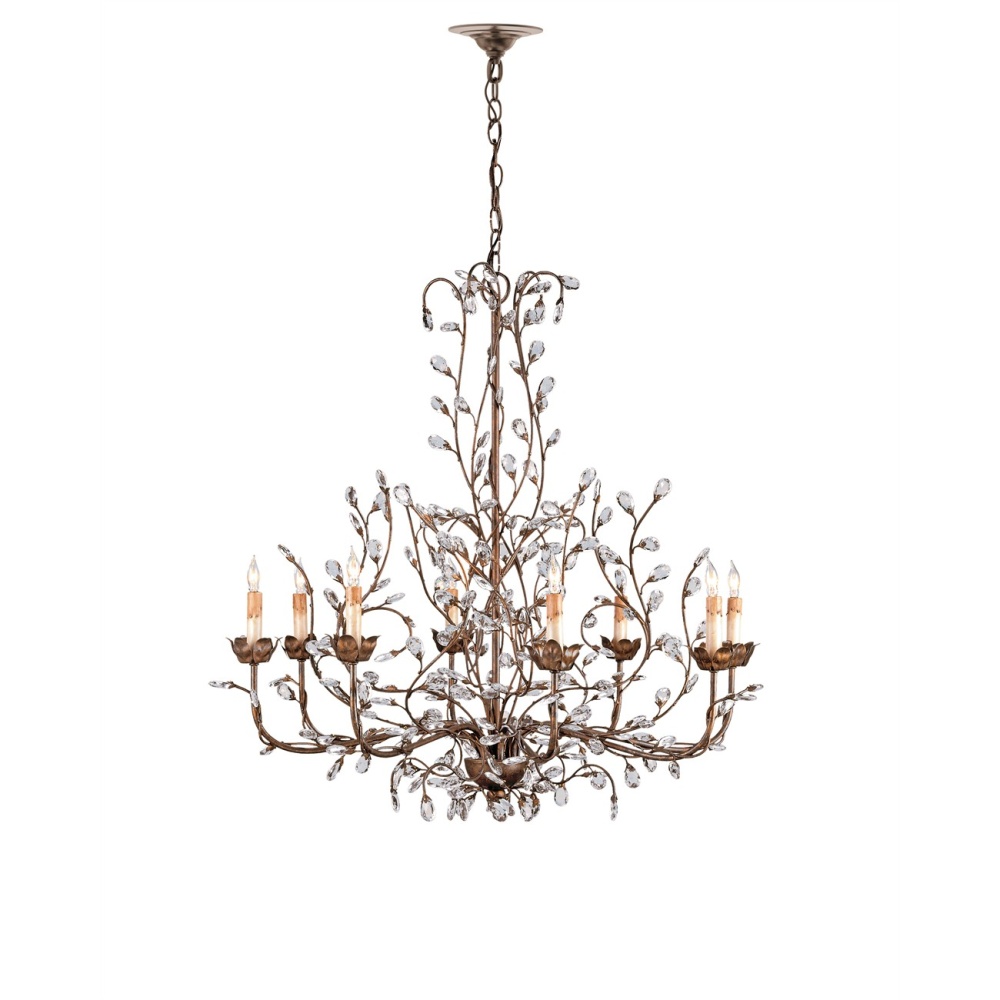 The pleasing attributes of nature merge with the conventions of finely crafted traditional design in the large version of our romantic Crystal Bud Chandelier. Delicate faceted crystals unfurl from the Cupertino-finished vines that make up the flowing profile of this idyllic piece. The eight-light chandelier is one of the fixtures in the varied Crystal Bud family of lights.
