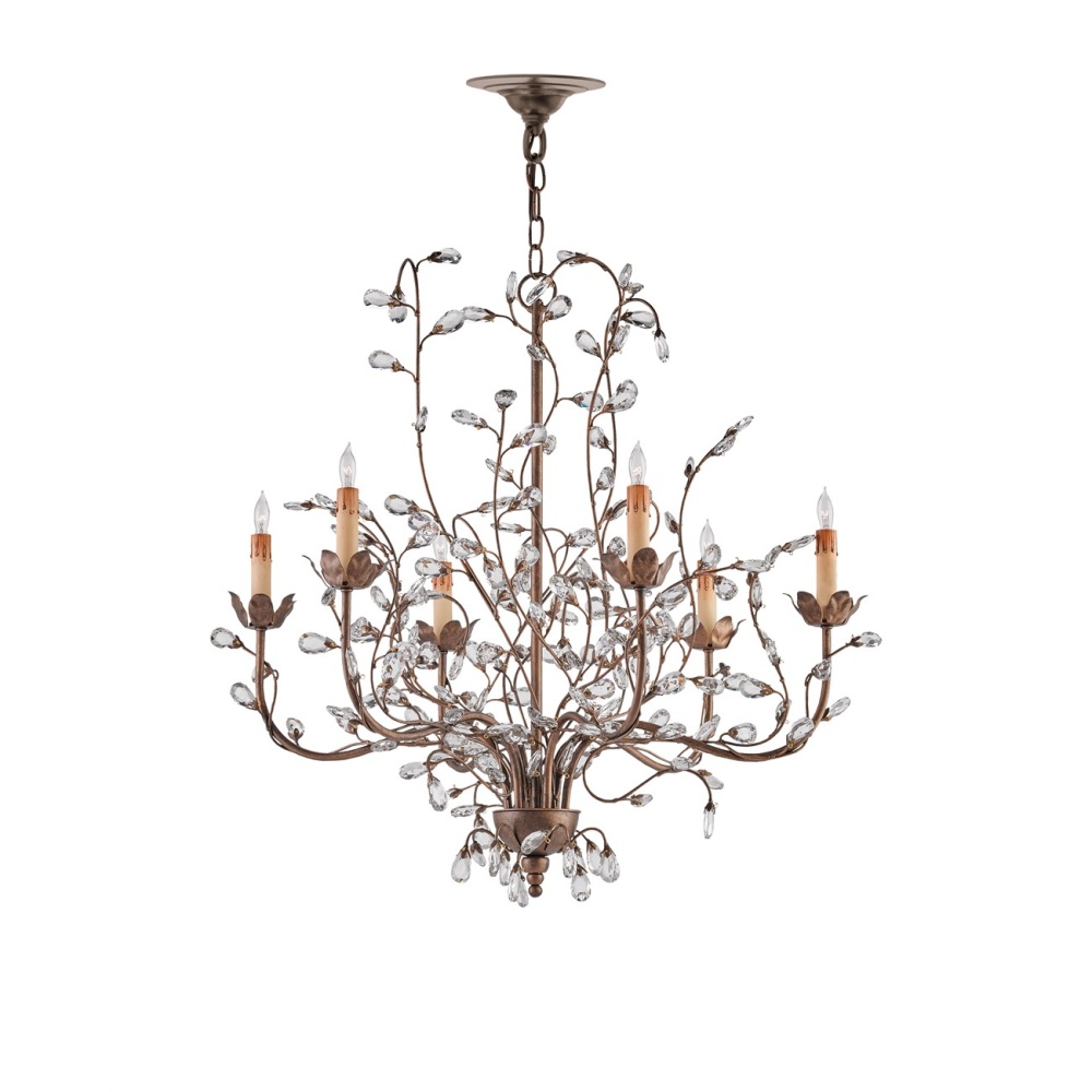 The pleasing attributes of nature merge with the conventions of finely crafted traditional design in the medium version of our romantic Crystal Bud Chandelier. Delicate faceted crystals unfurl from the Cupertino-finished vines that make up the flowing profile of this idyllic piece. The six-light chandelier is one of the fixtures in the varied Crystal Bud family of lights.