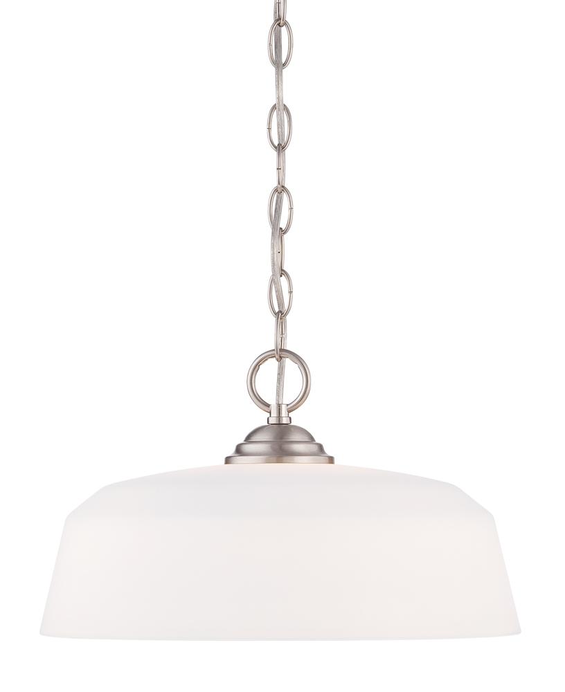 Darcy down pendants features a clean design with sleek lines and a softly molded opal glass shade, adding a touch of sophistication and modern elegance. These fixtures are built with a protective brushed nickel finish over a steel construction to look great and last for years to come. They come with all the hardware you need for easy installation.