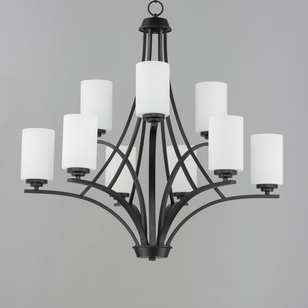 Low sloping arms of rectilinear tubing is finished in a variety of options that include Satin Nickel, Oil Rubbed Bronze, Matte Black, and a contemporary Satin Brass finish. Tall, cylindrical Satin White glass shades soften the light source within. Offered