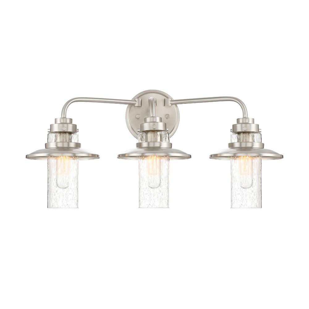 The Dover collection redefines farmhouse luxury while retaining farmhouse charm. With its satin platinum finish and clean lines, this 3-light bath bar will be the star of your bathroom. The clear seedy shades highlight the vintage style bulbs and create a unique pattern of light around the fixture. These bathroom lights are designed for damp locations such as over sinks in bathrooms and vanity areas, and they can be mounted with the shades facing up or down.