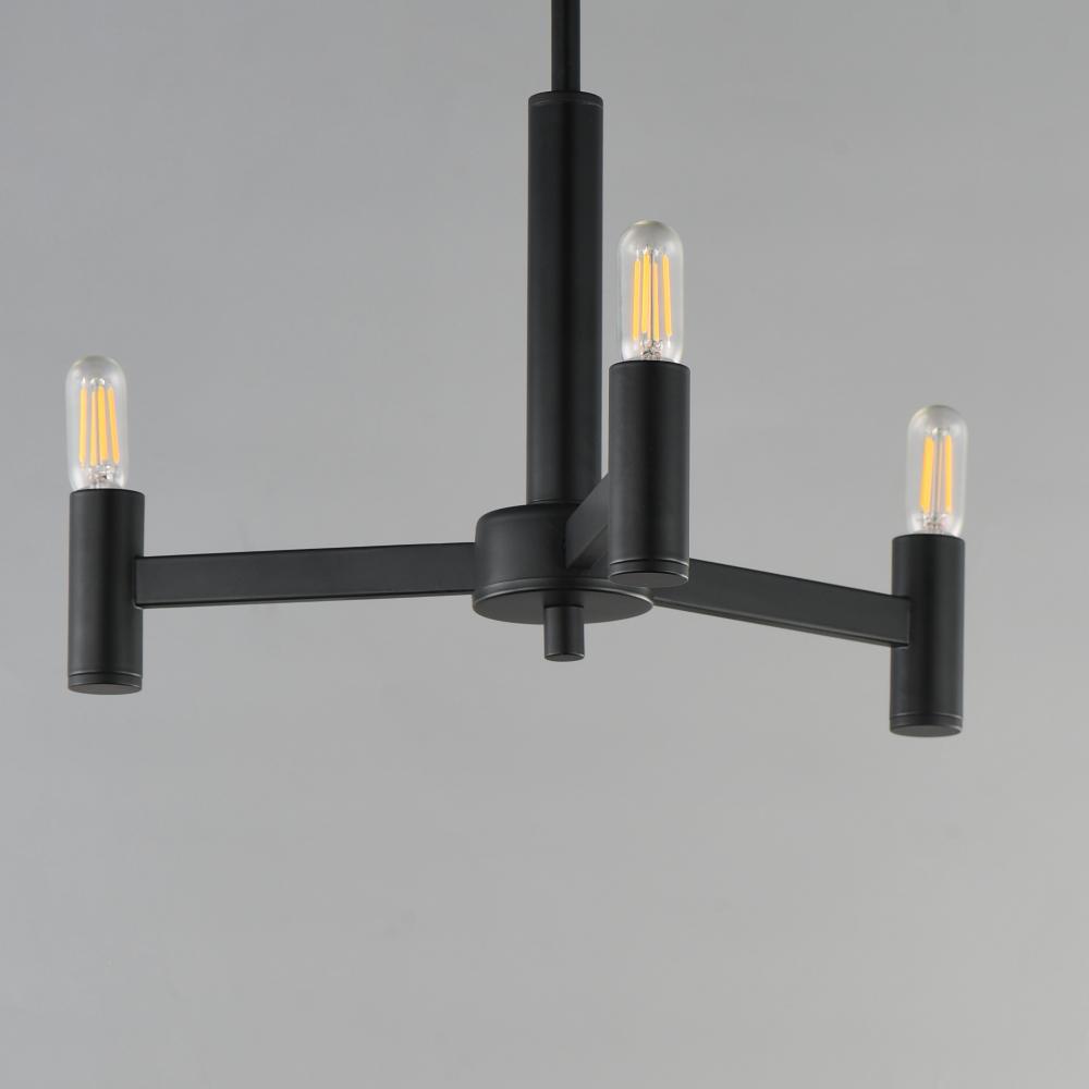 Straight extensions of rectilinear arms emanate from a cylindrical center housing in this transitional design. The candelabra is made in a corresponding cylindrical form playing into the geometries of this streamlined chandelier design. Available in a text