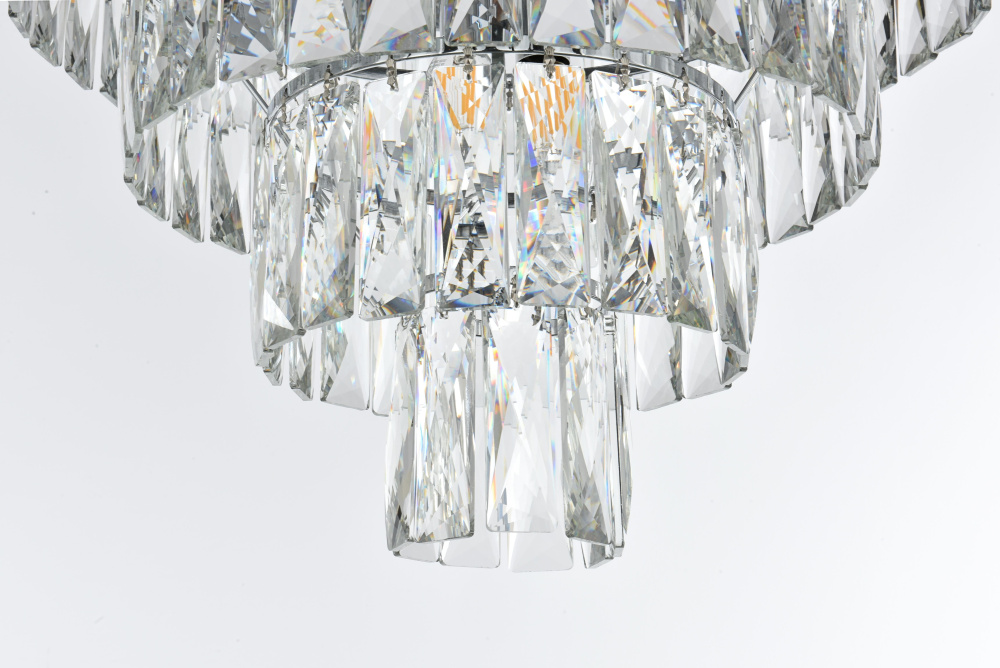 Transform your space with this extraordinary flush mount that reimagines classical crystal design for contemporary interiors. The masterfully engineered silhouette features four graduating tiers that create a spectacular inverted pyramid, reminiscent of a frozen cascade captured in mid-descent. Each precisely cut rectangular crystal is strategically positioned to maximize light play, creating mesmerizing displays of fractured light throughout your space. The substantial scale makes this fixture an ideal centerpiece for bedrooms, closets, hallways, sophisticated dining rooms, or executive offices. The thoughtful construction incorporates six light sources distributed throughout the tiers, ensuring both spectacular illumination and enchanting crystal animation. The robust iron framework provides a secure foundation while maintaining visual lightness, allowing the crystals to appear as if floating in space. Available in reflective chrome, sophisticated black, or warm satin gold, this flush mount makes an unforgettable statement while maintaining refined restraint. The cascading arrangement creates a sense of movement and flow, while the geometric precision of each crystal adds contemporary edge to the classical form. This is more than a light fixture – it's an architectural feature that transforms your space through its commanding presence and spectacular light performanc