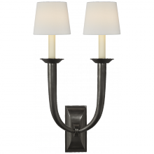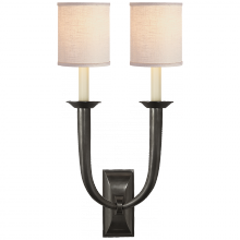 French Deco Horn Double Sconce in Hand-Rubbed Antique Brass with Linen Shades