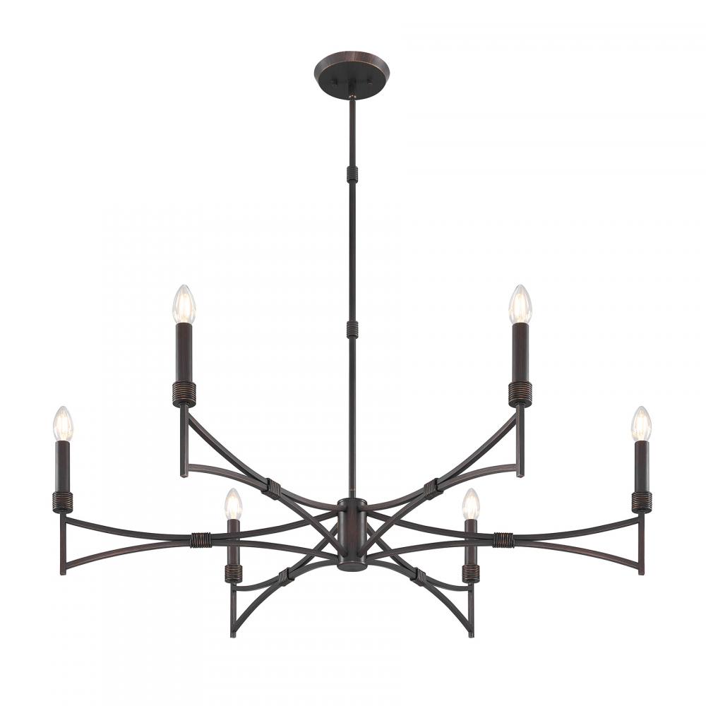 It is often said that lighting is the jewelry of the home. The Savoy House Gardner 6-light chandelier perfectly exemplifies this saying! It features dramatically curving bowtie-like arms that wear wrapped metal accents as if they were bangles. These metal accents also adorn the downrod and the base of each candle. The Champagne Mist finish is bold, beautiful and textural. Gardner is 40" in width and has an adjustable height ranging from 5" to 59". It uses six candelabra size bulbs of up to 60 watts per bulb. Bulbs not included. Comes with two 12" downrods and one 6" downrod.