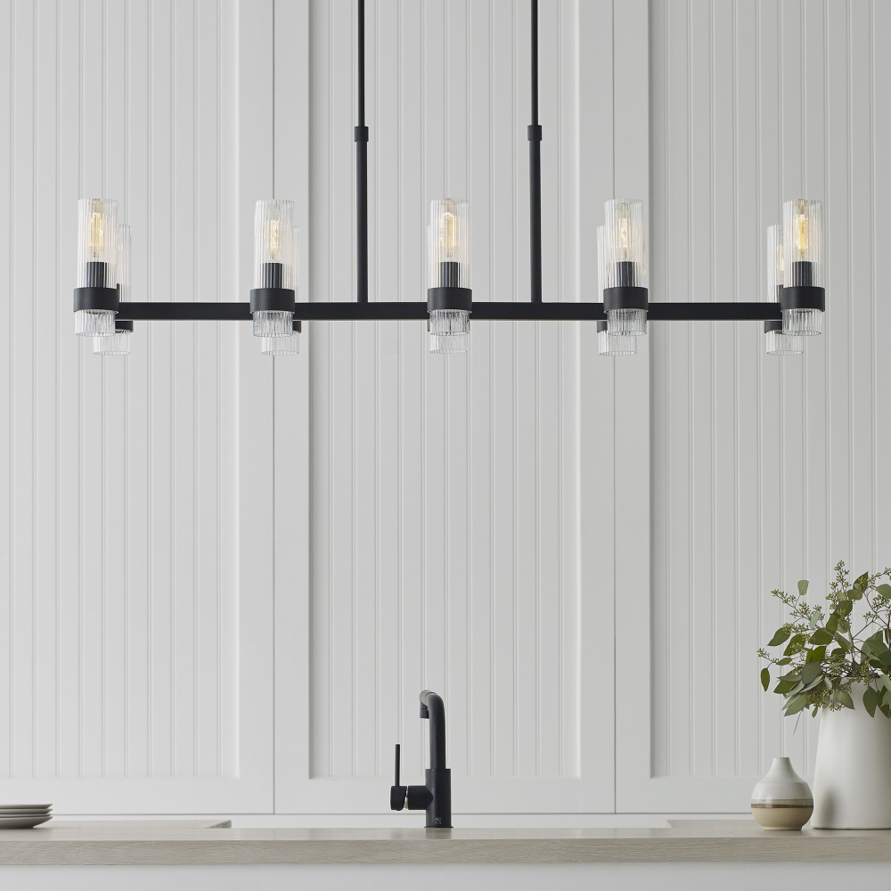 Designed by Chapman & Myers, the Geneva ten light billiard island chandelier in Aged Iron is the perfect way to achieve your desired fashion or functional needs in your home. A fluted shade forms an elegant, dynamic silhouette balanced by a strong frame of Aged Iron, Burnished Brass, or Polished Nickel.