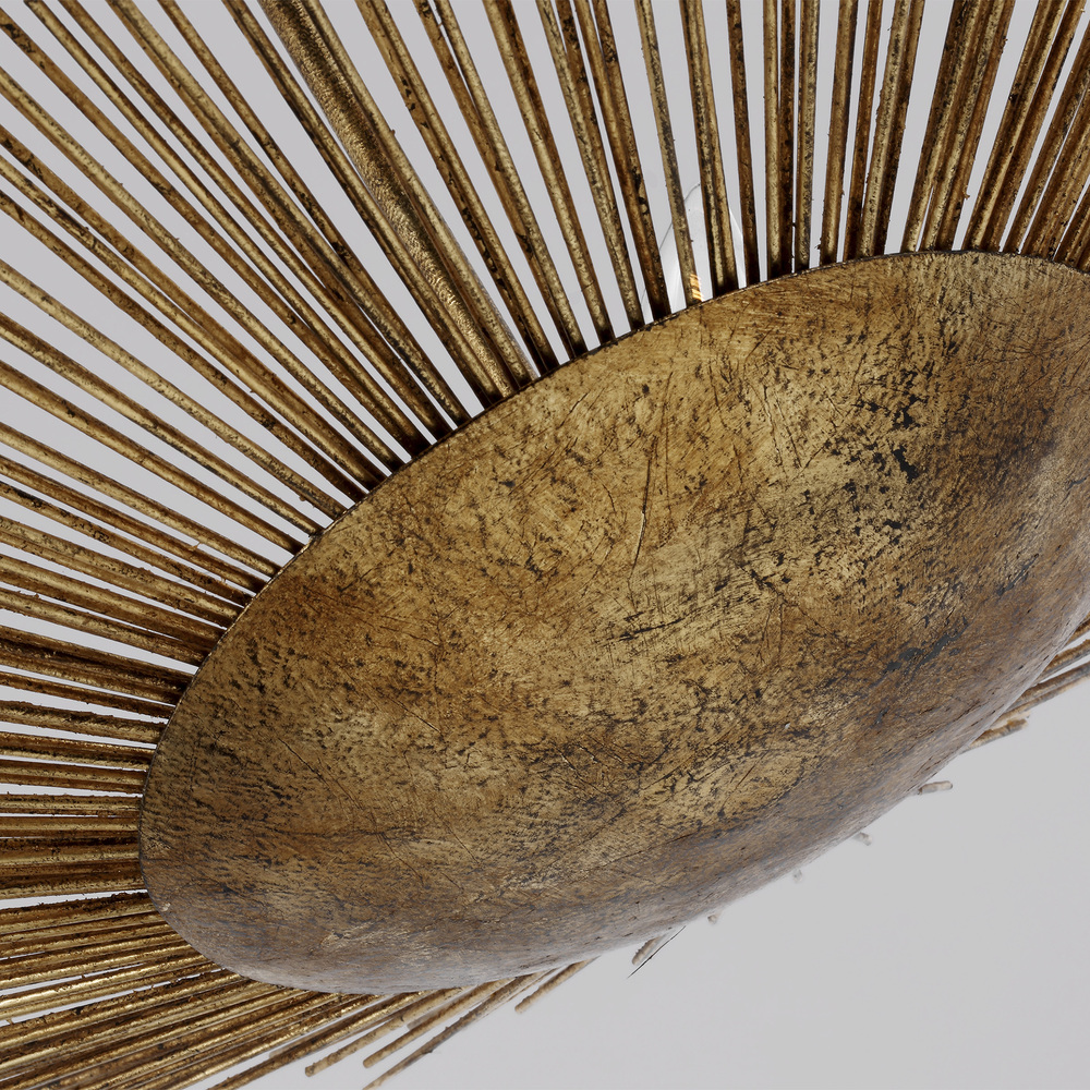 Named after the Greek God of the Sun, the Alexa Hampton Helios four light indoor pendant in Antique Gild is made with hand applied gold leaf and then hand distressed. This Mid-Century Modern fixture takes the shape of its name, with up-flowing stems resting elegantly on a round metal canopy with each metal rod hand cut and hand welded straw-like brass layers forming the shade of this textural fixture. The Helios flush mount features a dynamically cut, sun-like form and gilded iron finish. This stunning piece is an eruption of light and brings a stylish presence to any aspect of your space. The assortment includes a four-light wide pendant, six-light small pendant, eight-light tall pendant, three-light semi-flush and one-light pocket sconce. Alexa Hampton is an industry force who honors tradition and commits to the future, providing smart, stylish, design-rich solutions for every aspect of the home.