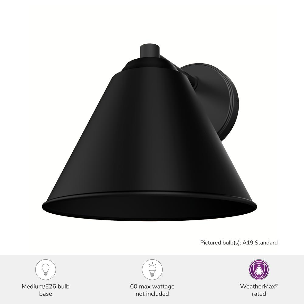Highlight your outdoor spaces with the Aeronaut 1 Light Small Outdoor Wall Light in Matte Black. Featuring a sleek, cone-shaped design, this modern wall light adds a touch of sophistication to any setting. Built with ultra-durable WeatherMax® technology, it’s engineered to resist corrosion, making it ideal for all outdoor areas, including those exposed directly to rain and salt air. Whether you're lighting up your patio or front porch, the Aeronaut Collection featuring an outdoor lighting and matching outdoor ceiling fan combines style and durability, ensuring it looks great while standing up to the elements.