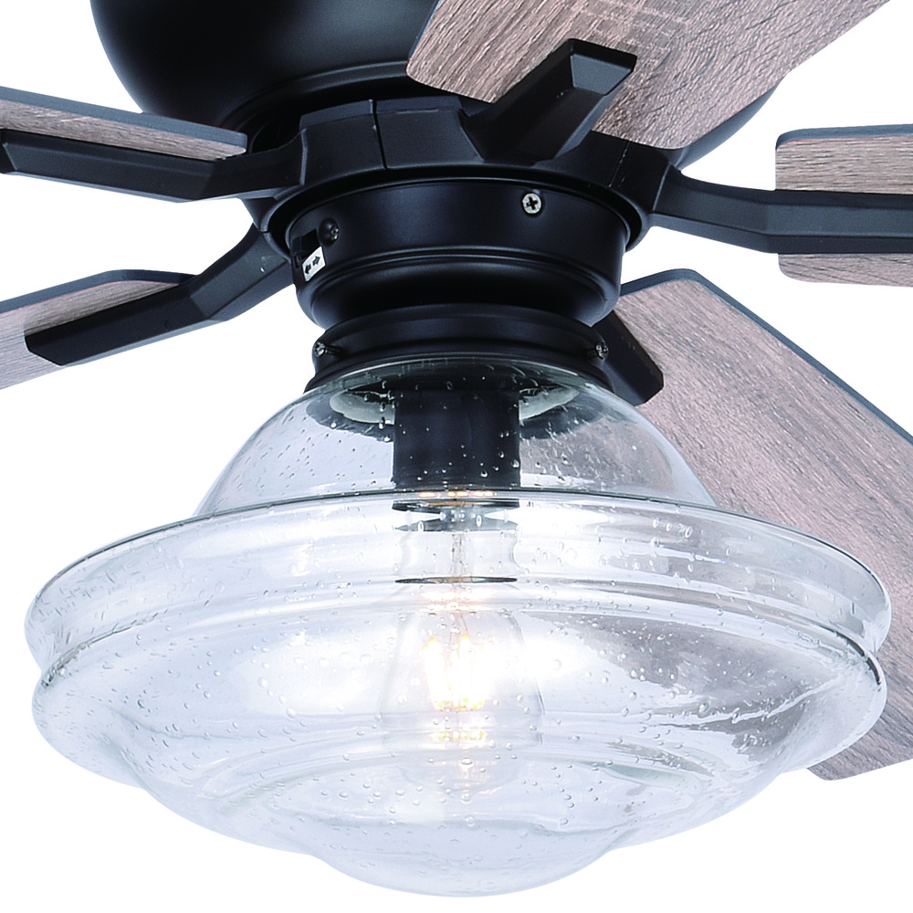 The Huntley is a timeless collection inspired by mid-century small-town aesthetics. The vintage schoolhouse glass is the focal point of this design with its unique profile. Add a vintage Edison style filament bulb to the included light kit to complete the look. This fan is compatible with sloped ceilings and includes a 6 inch down rod (longer down rods sold separately). Remote control included for added convenience.